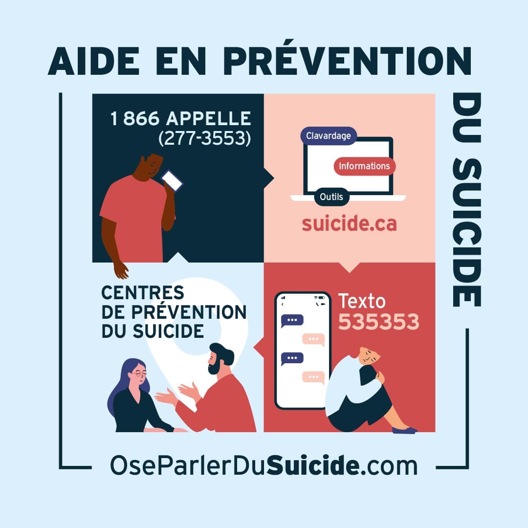 N’hésitez pas à demander de l’aide. Il existe des centres de la prévention du suicide partout au Québec. Selon les régions, des équipes des CIUSSS collaborent aussi avec différents partenaires de la communauté et les membres de l’entourage. Il existe également plusieurs outils. Voici un bottin des ressources pour toutes les régions du Québec.