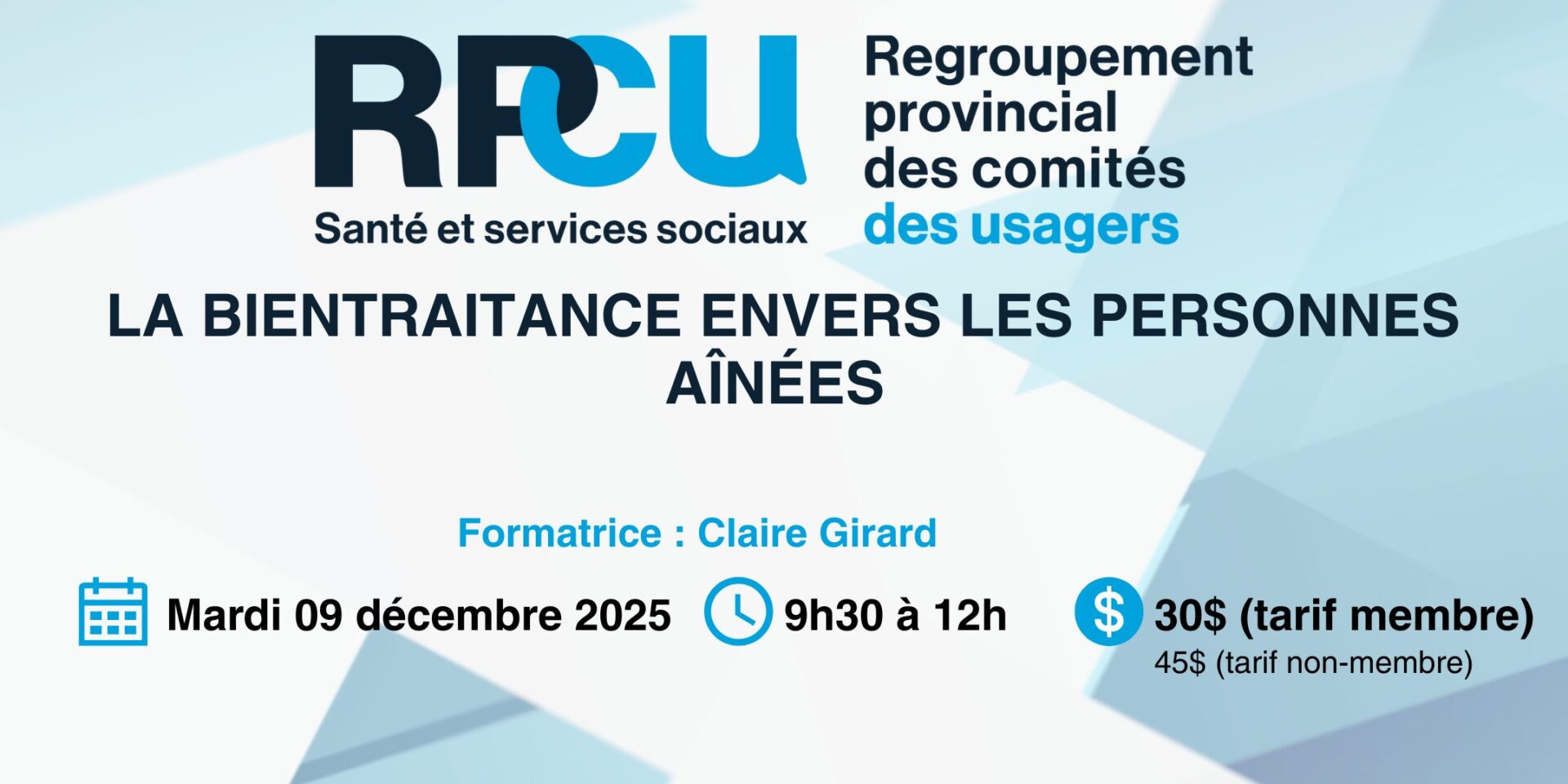 Le RPCU vous propose une nouvelle formation sur la bientraitance envers les personnes aînées. La formation permettra de définir les principes fondamentaux de la bientraitance, d’aborder des exemples concrets et le rôle des comités en lien avec ce sujet.