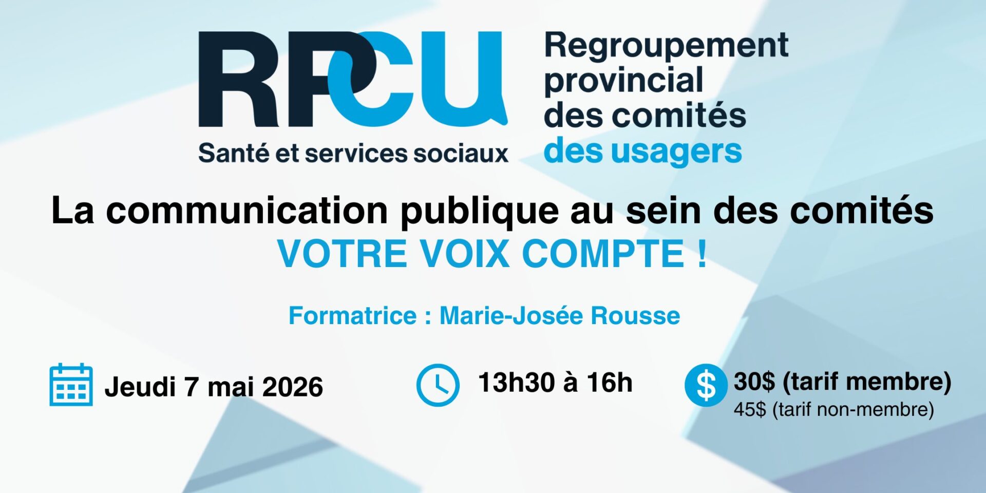 Les comités des usagers et de résidents ne sont pas connus par la grande majorité des usagers et du grand public. C’est un enjeu majeur dans la défense des droits des usagers. Le RPCU vous propose donc une toute nouvelle formation afin de mieux vous outiller dans vos communications publiques car votre voix compte !