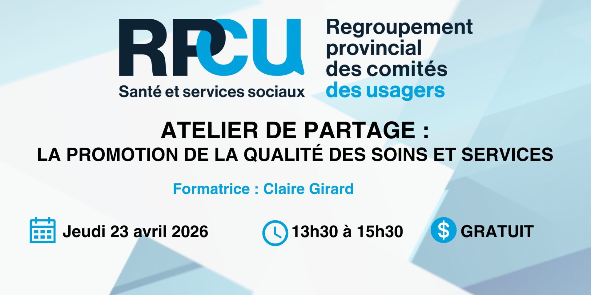 Cet atelier vous permettra d’échanger avec des membres de d’autres comités d’usagers et de résidents sur les bonnes pratiques vous permettant de vous acquitter de vos fonctions de promouvoir l’amélioration des conditions de vie des usagers et de votre participation à l’évaluation du degré de satisfaction des usagers que vous représentez. Un outil facilitant vos communications vous sera  proposé afin d’attirer l’attention des membres de la direction notamment pour influencer les décisions.