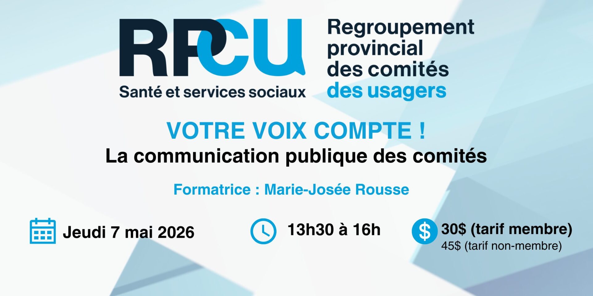 Il s’agit d’une formation payante : 30$ pour les personnes d’un comité membre du RPCU, 45$ pour les non membres