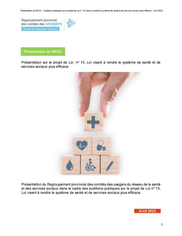 - 20 avril 2023Présentation sur le projet de Loi no 15, Loi visant à rendre le système de santé et de services sociaux plus efficace
