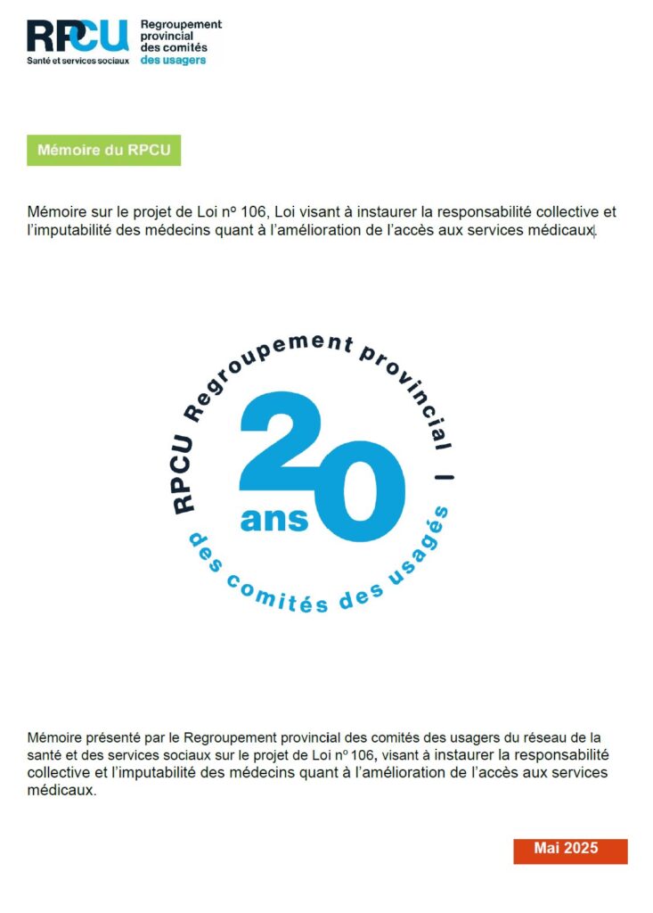 - 25 mai 2025Projet de Loi 106, Loi visant à instaurer la responsabilité collective et l’imputabilité des médecins quant à l’amélioration de l’accès aux services médicaux